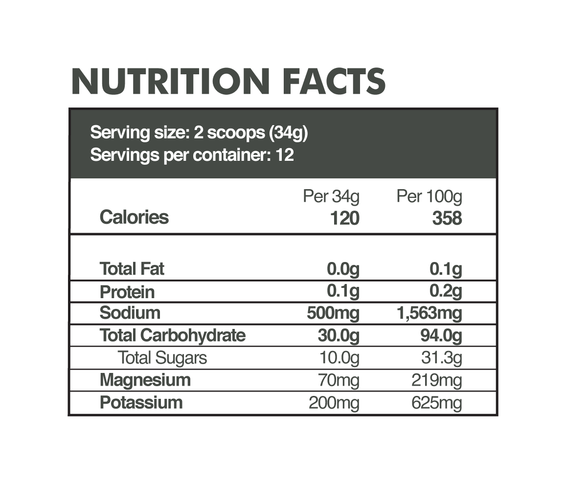 70% Sodium Citrate : 30% Sodium Chloride. The backbone of hydration. Replaces critical sweat losses, sustains performance, and buffers muscle acidity under heat and intensity.